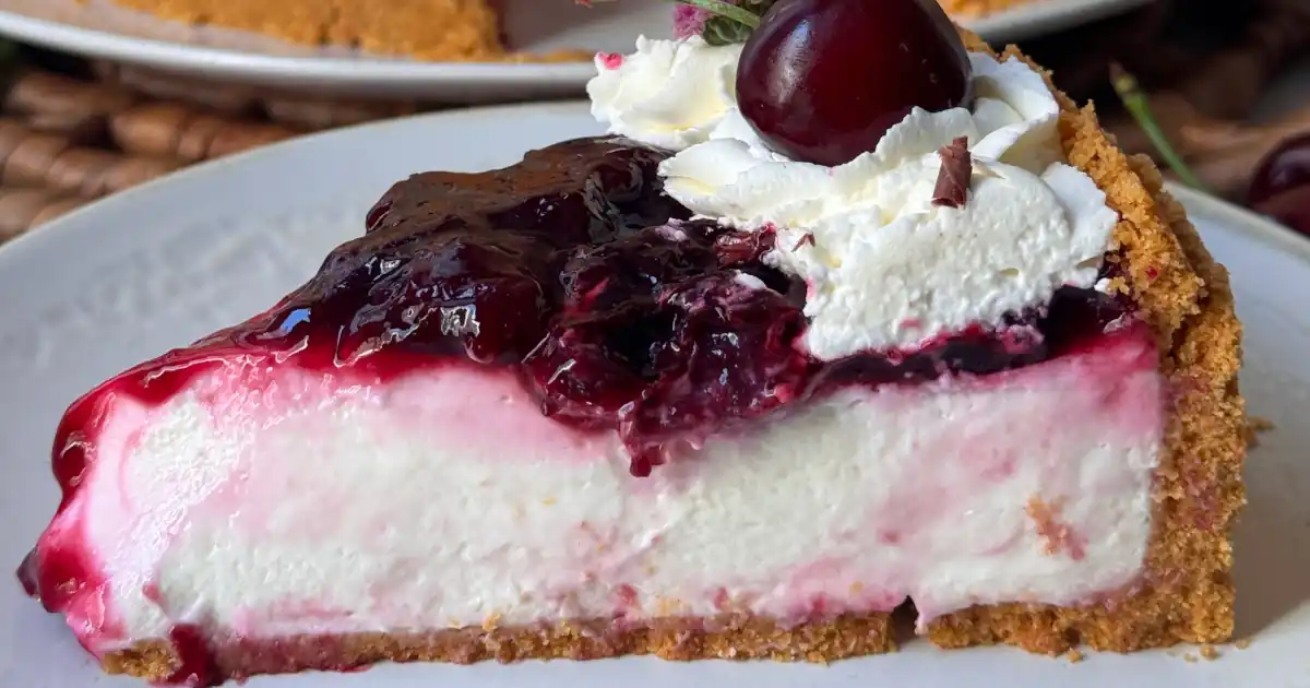 Fresh, creamy and no-bake 😍 This tart combines the smoothness of the filling with a crunchy base and a fruity cherry topping 🍒 that will win you over.