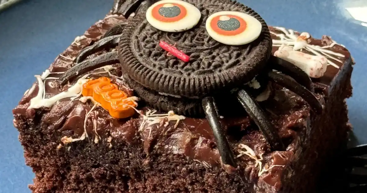 It is soft, moist and fluffy. Covered with chocolate ganache and decorated with spiders made from Oreo cookies and liquorice. This cake will make your taste buds tremble 😋👻🕷️🖤🕸️