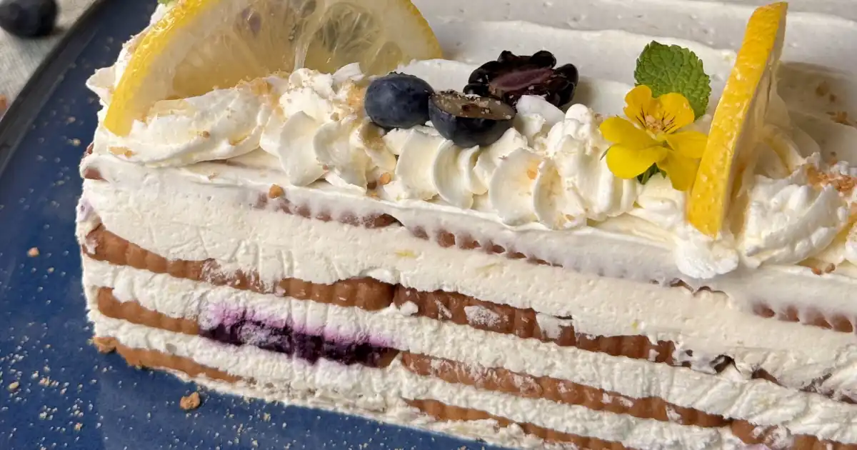 I’m sharing this easy-to-make recipe that turns out delicious. It’s a cake with layers of cookies, lemon-flavored cream, and blueberry jam.